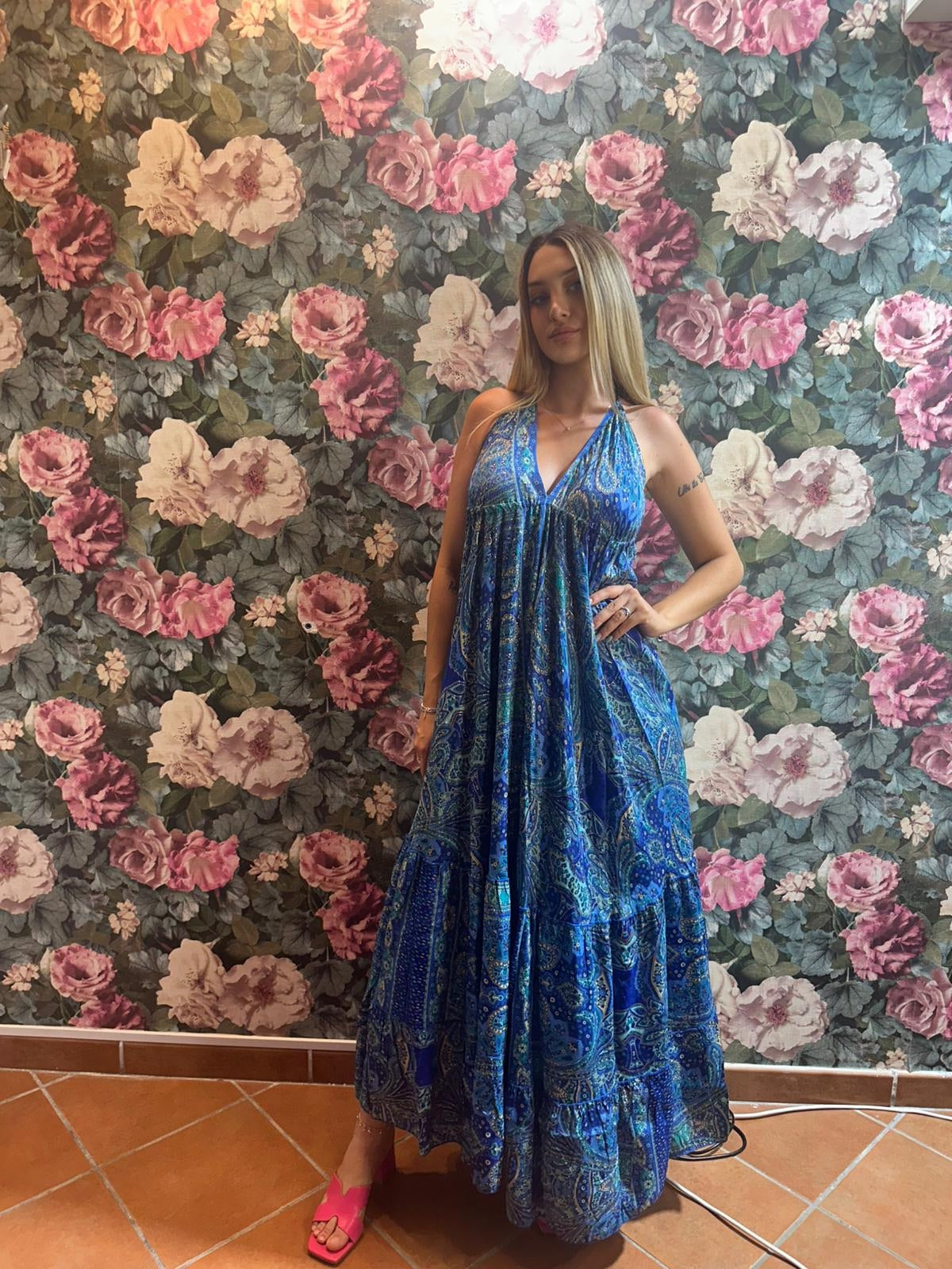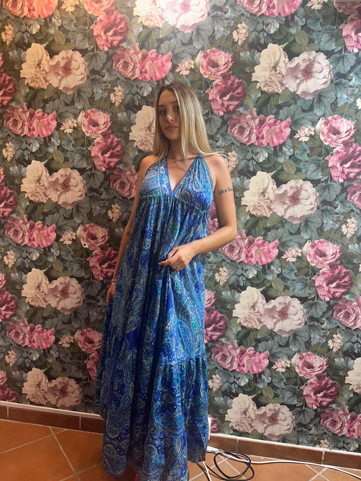 Abito Blu India con spalline e scollo posteriore svela la tua femminilità e ti fa sentire elegante. Realizzato con materiali di alta qualità e un taglio impeccabile, è perfetto per qualsiasi occasione formale. Il design a bretellina e lo scollo posteriore aggiungono un tocco di sensualità.