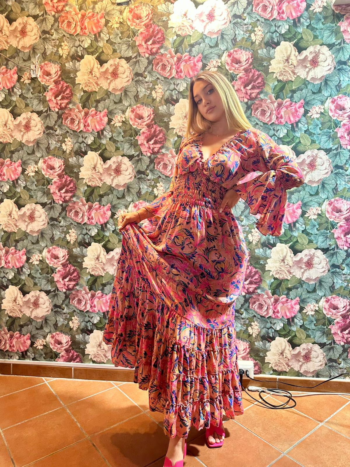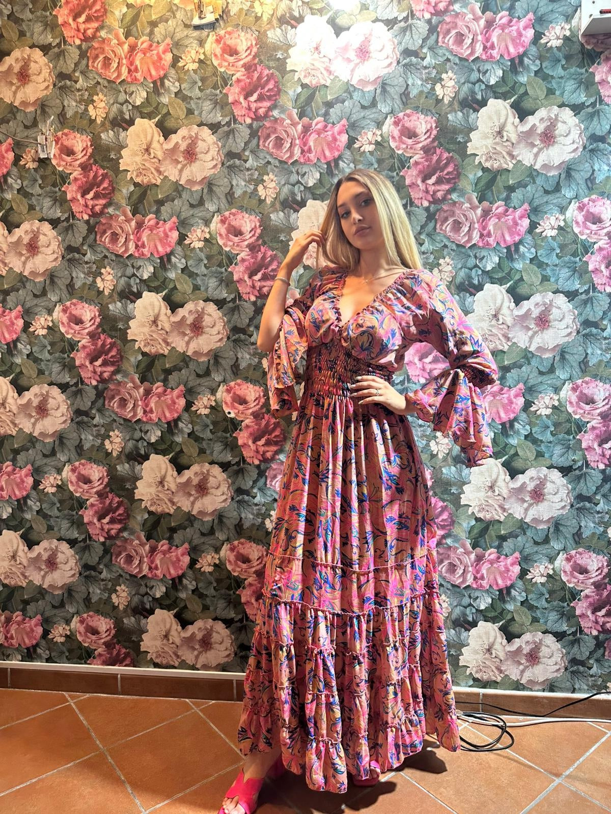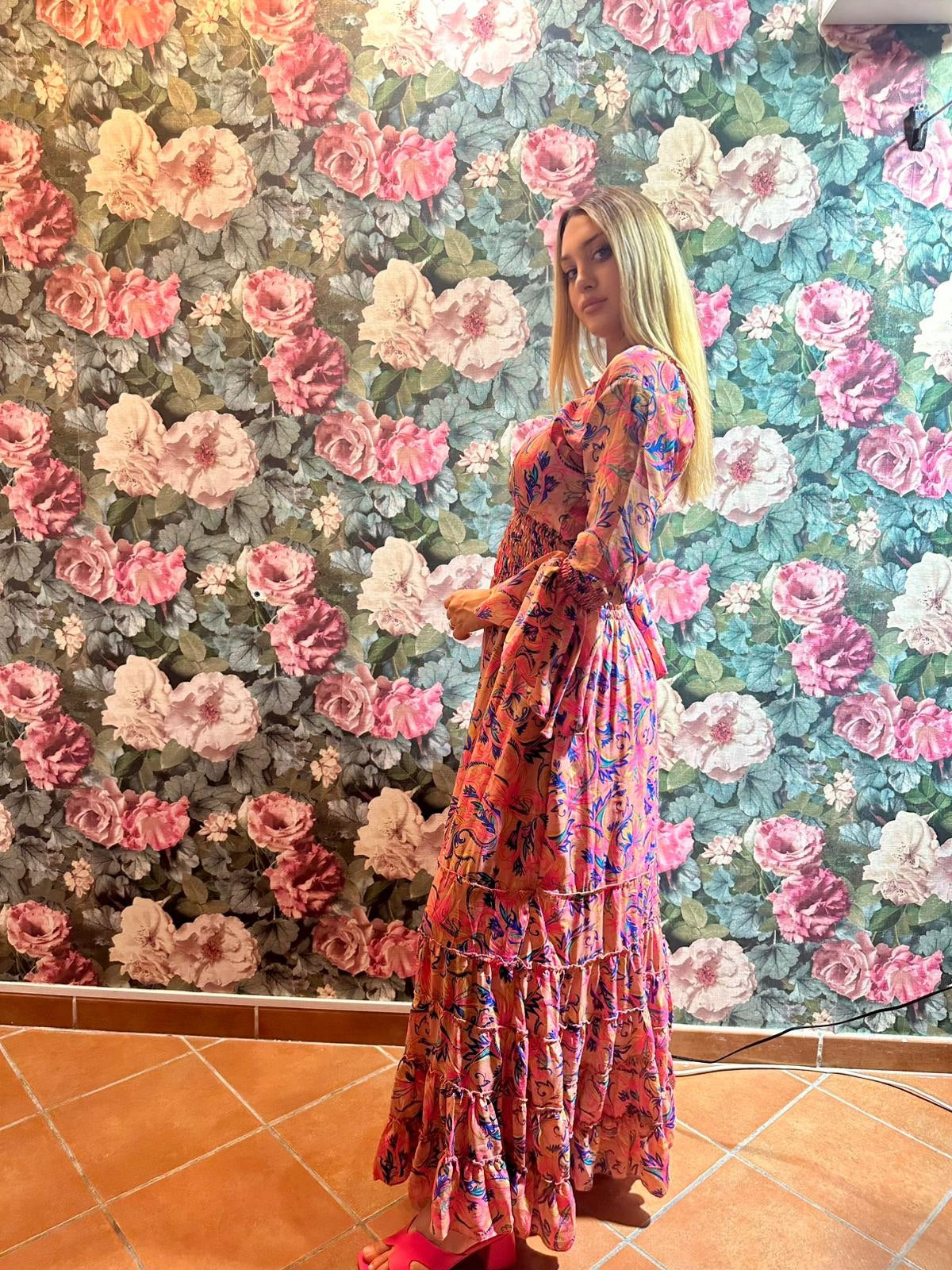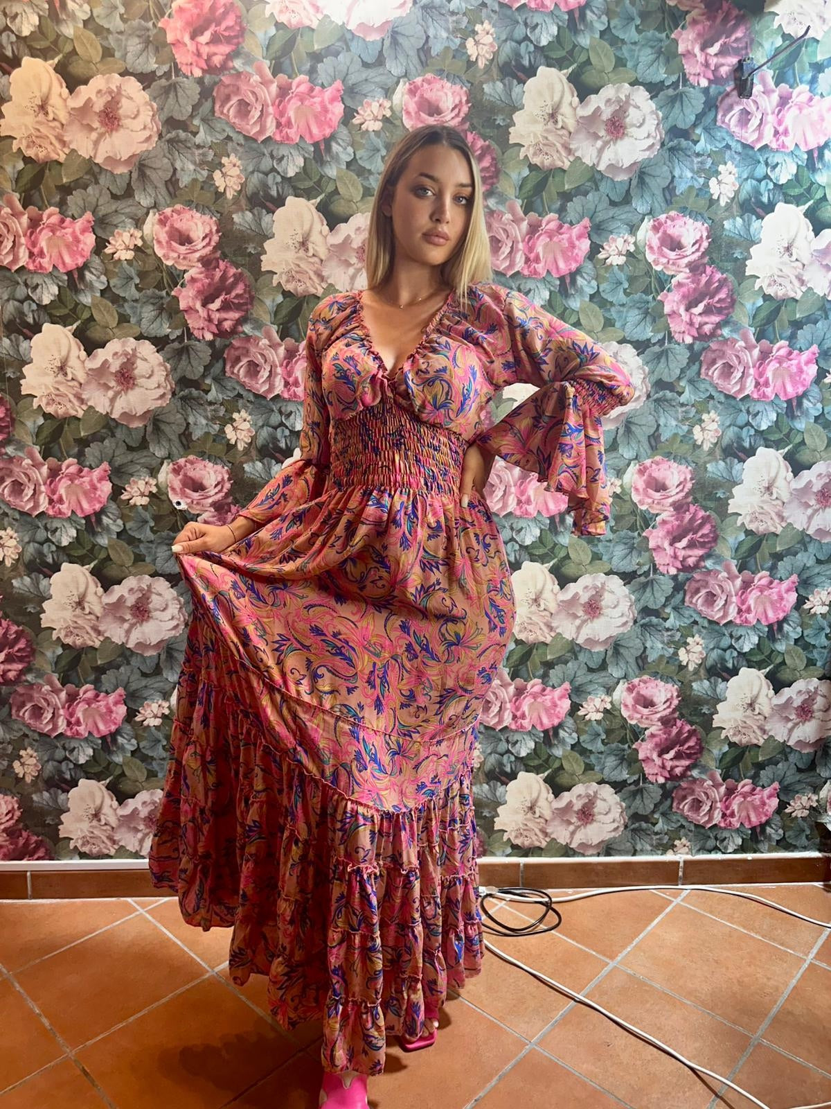 Lasciati avvolgere dalla bellezza orientale con il nostro vestito Divindia. Realizzato con dettagli tipici dell'abbigliamento indiano, con maniche lunghe a farfalla, questo abito ti farà sentire elegante e sofisticata. Perfetto per ogni occasione, dona un tocco di esotismo al tuo stile.